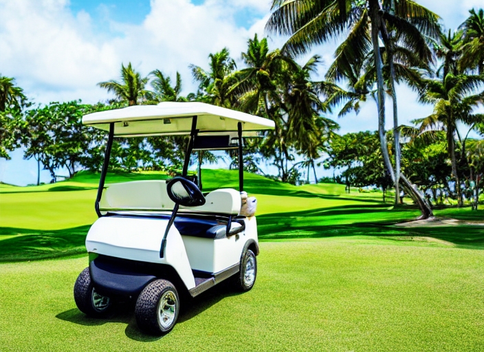 Guam, Micronesia, 9 January 2018: Idyllic view of golf cart on the green landscape on background. Golf course activity is main part of leisure in paradise island. Golf landscape view with green grass