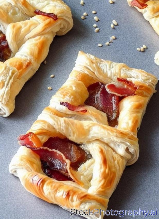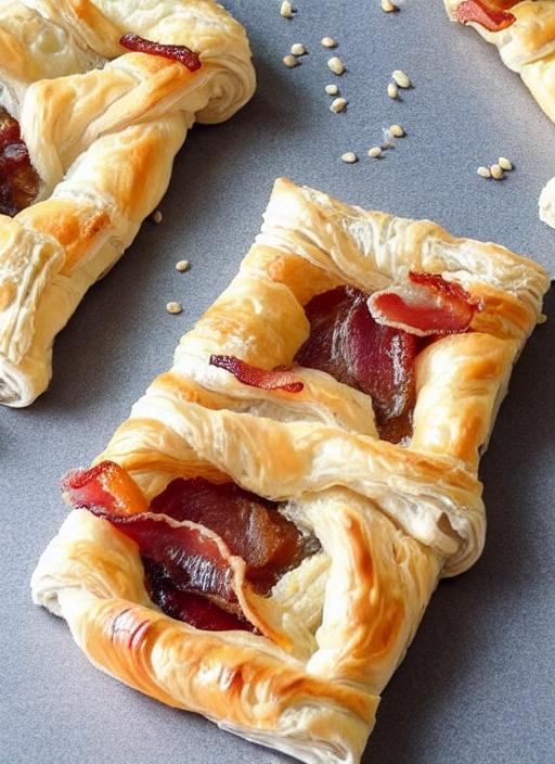 Unsweetened snails and puff pastry with bacon and sesame seeds. Comfortable and simple food.