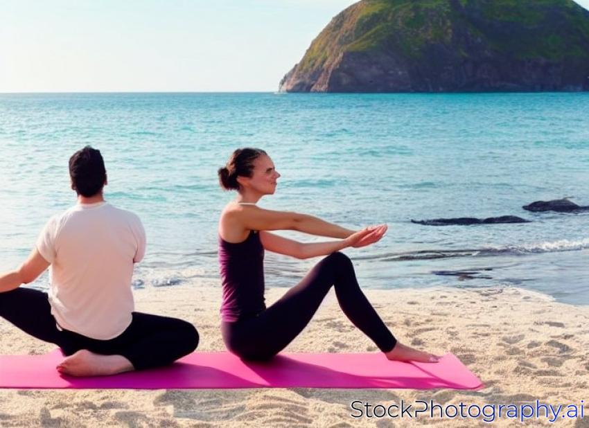 20-29 30s activity adult balance beach body breathing calmness caucasian couple daytime european exercising female fit flexible girl guy healthy hobby lifestyle male man meditating morning nature ocean outdoors peaceful people pose relashionship relaxation sand sea serene sitting smiling sports stretching sunny two water wellbeing white woman yoga young-