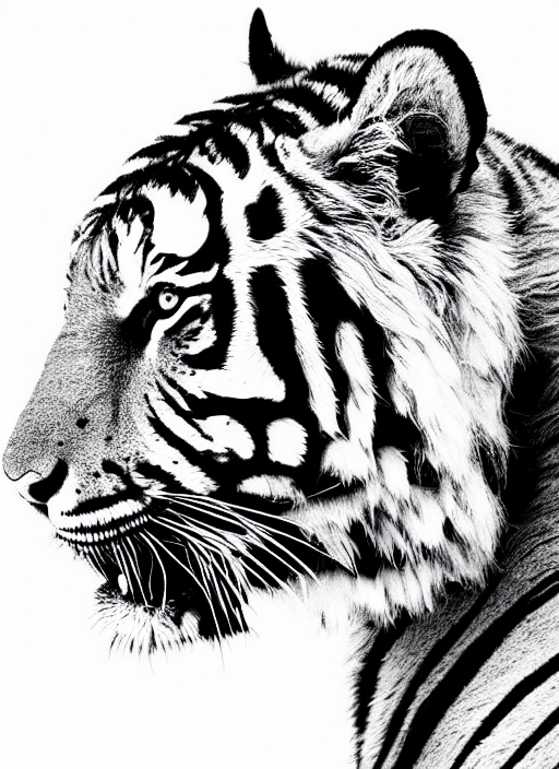 artwork of tiger face portrait, head silhouette, black and white sketch digital drawing, isolated on white background, raster version