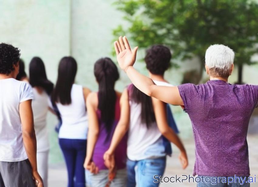 back view of shoolboy waving hand to smiling multicultural friends