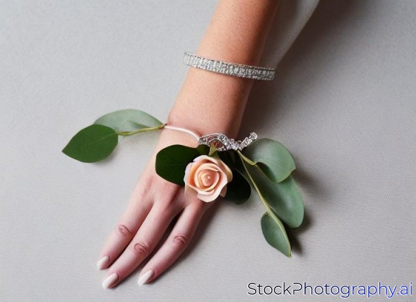 bracelet from the pion-shaped rose and eucalyptus on the hand of the bridesmaid