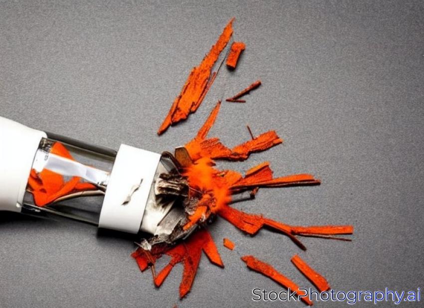 broken upright light bulb with smoke and lots of shards in orange red back