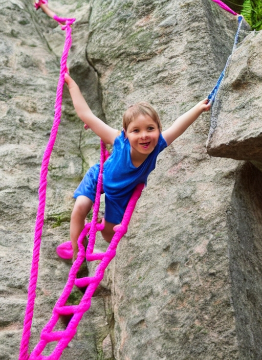 children climbing pink rope ladder