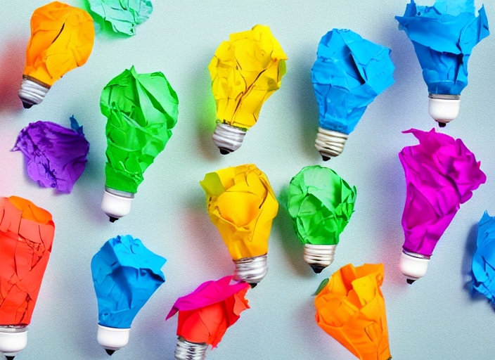 creative inspiration from brainstorm colorful concept crumpled paper light bulb metaphor for good idea from teamwork / solution thinking answer from harmony people work