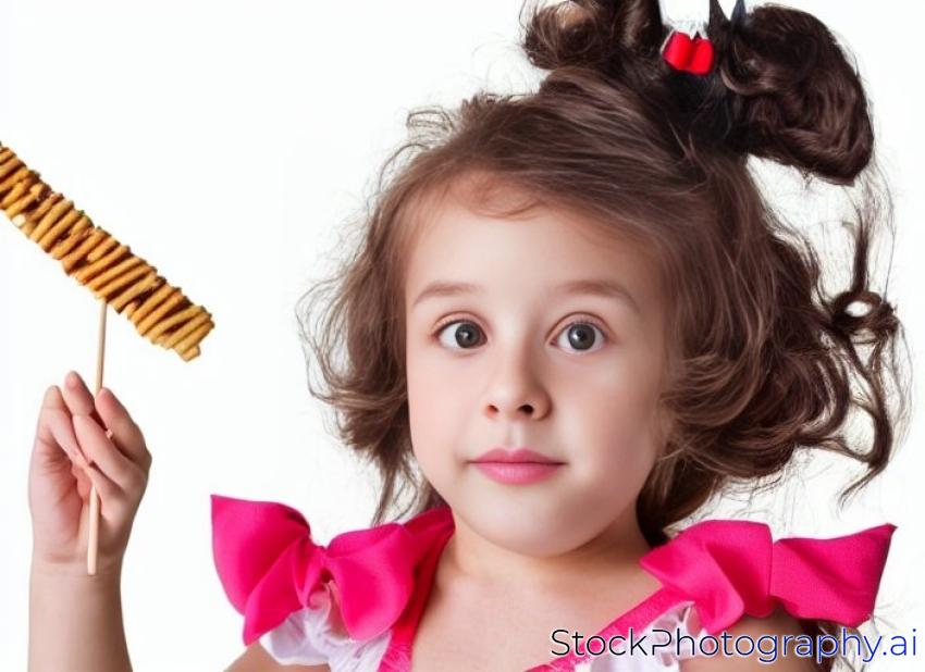 cute little girl holding false moustache and monocle on party sticks isolated on white