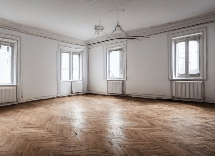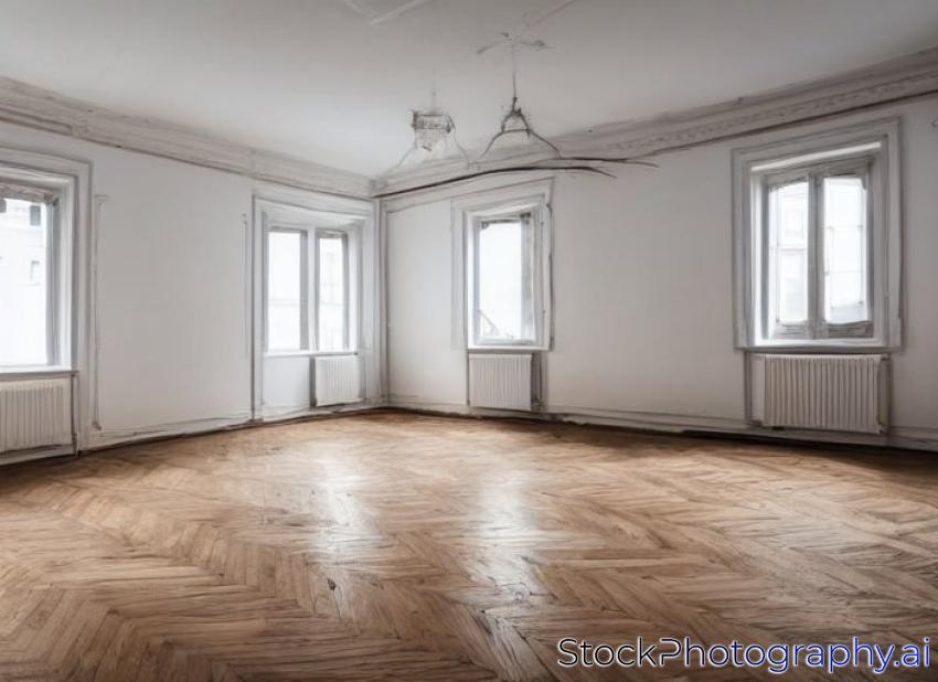 empty room in old apartment building with parquet floor and big wooden windows -