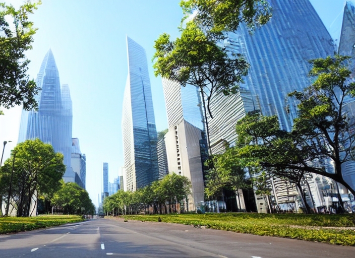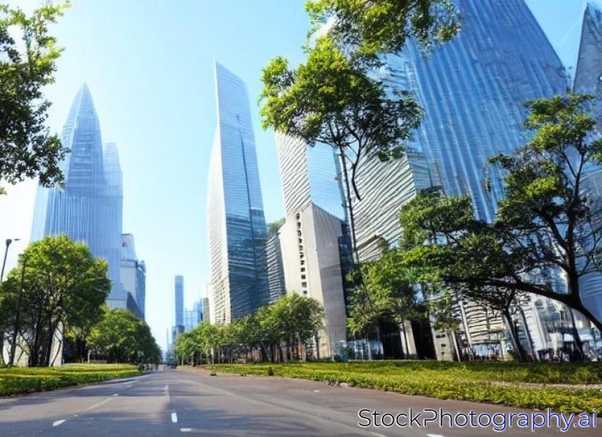 empty street with trees aside and skyscrapers as background