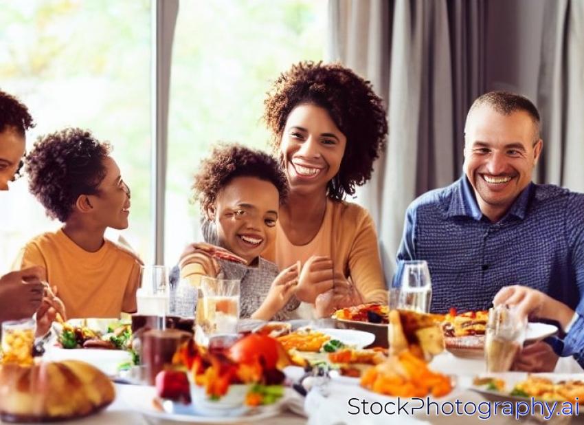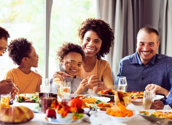family, holidays, thanksgiving, generation and people concept - smiling family having dinner at home
