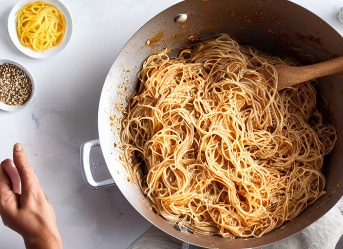 female hands raising cooked spaghettis out of the pot