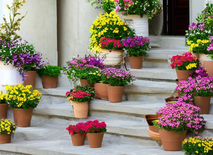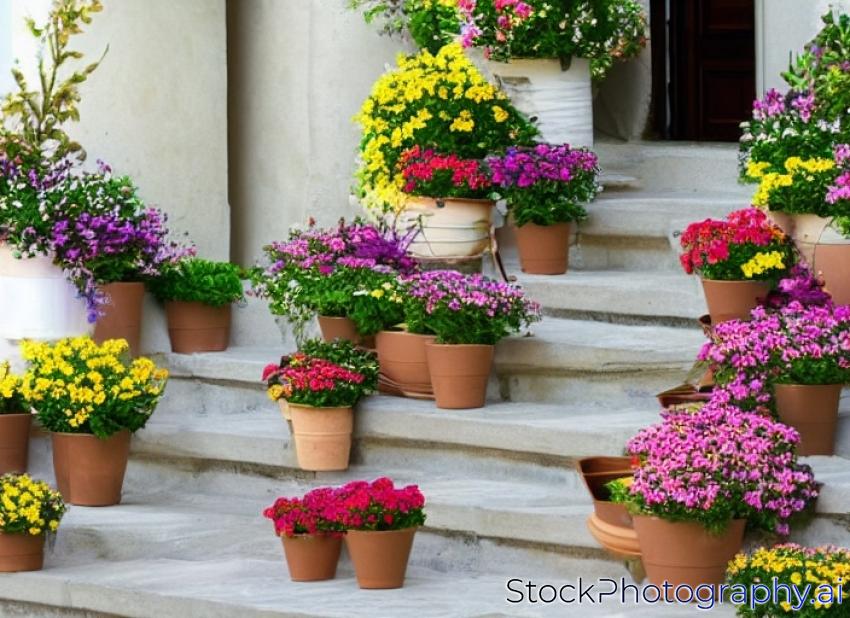 floral design of the steps. flowers in baskets and pots. decoration of the terrace