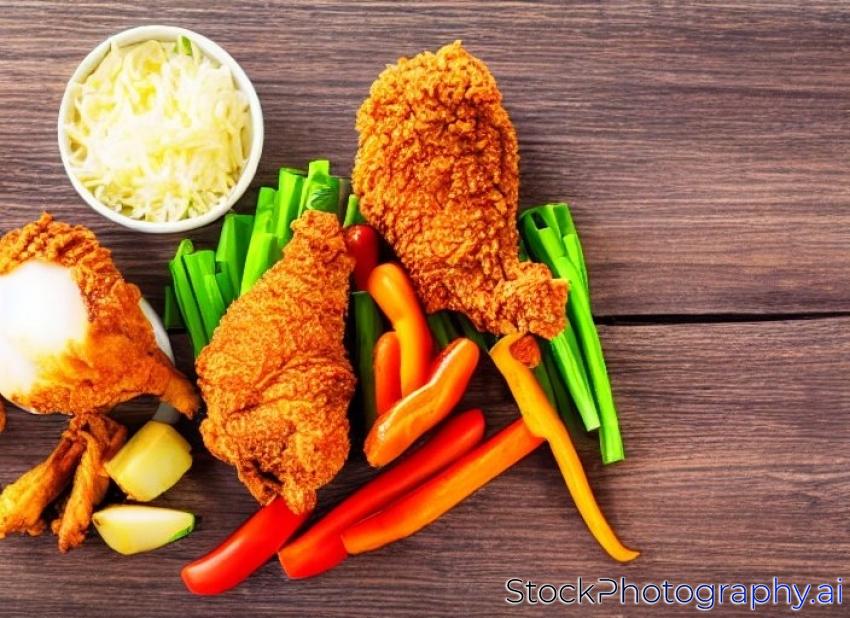 fried chicken drumstick and vegetables on wooden background.