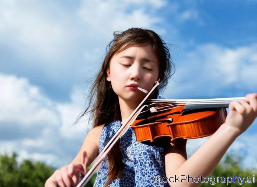 girl plays violin against sky