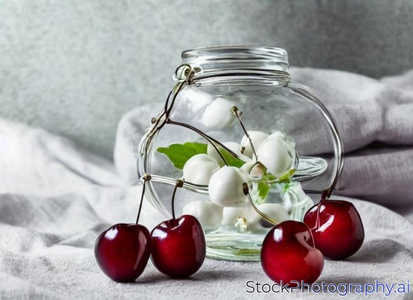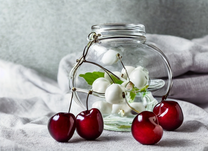 glass jar with white cherries close up