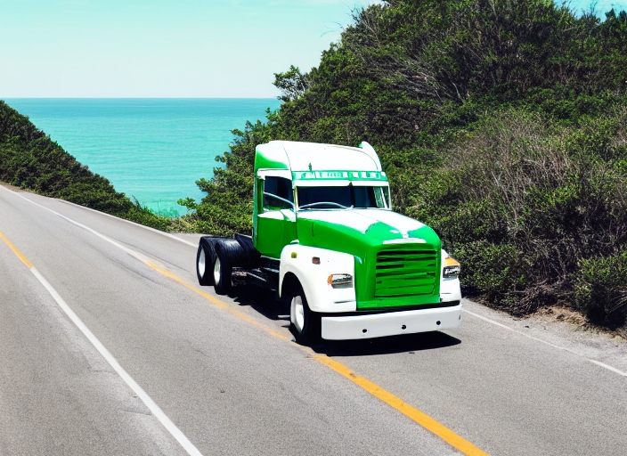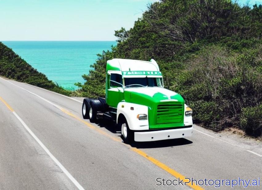 green and white truck on the move, scenic highway and sea, wide angle