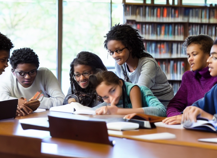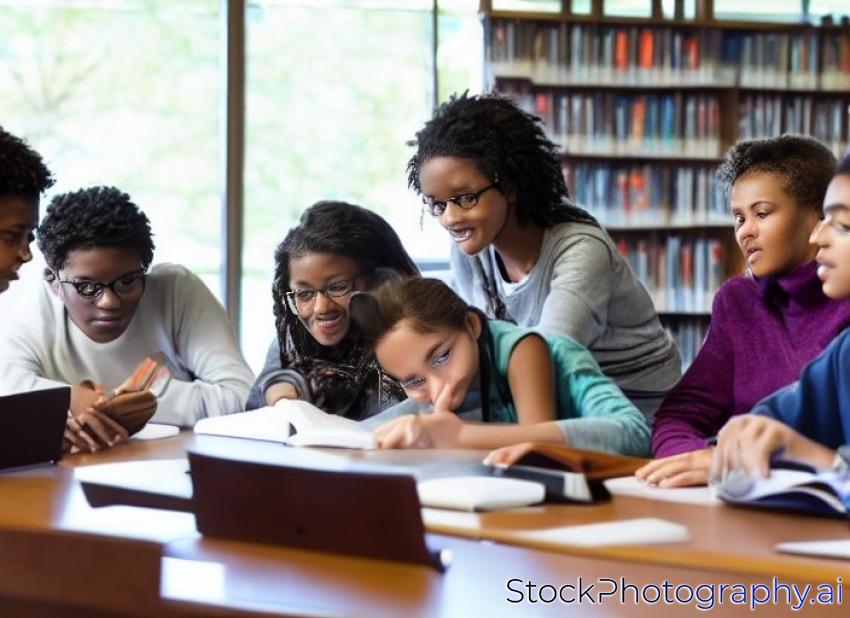 group of students engaged in learning at the desk in the library
