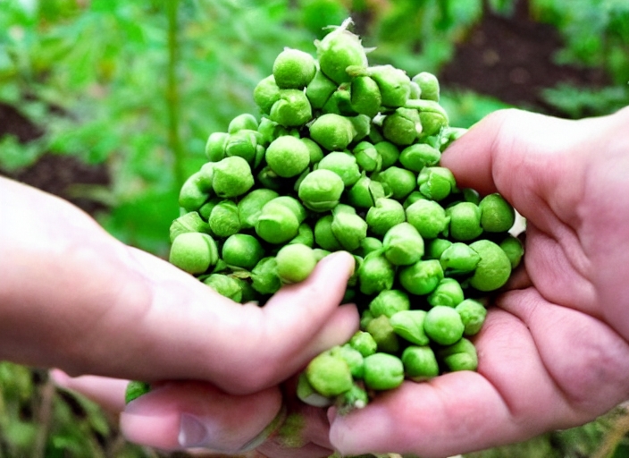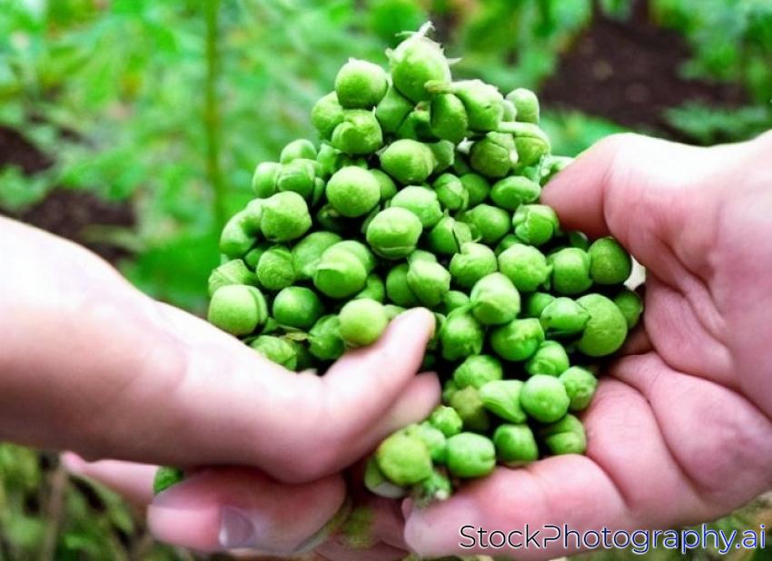 hand holding green peas pods at the garden
