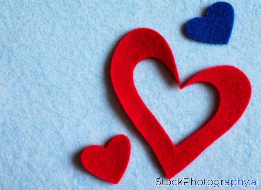 handmade red love hearts of felt against blue, sky