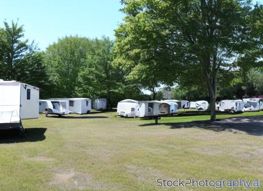 large Parking lot on a green meadow near the lake shore for mobile homes, campers, trailers