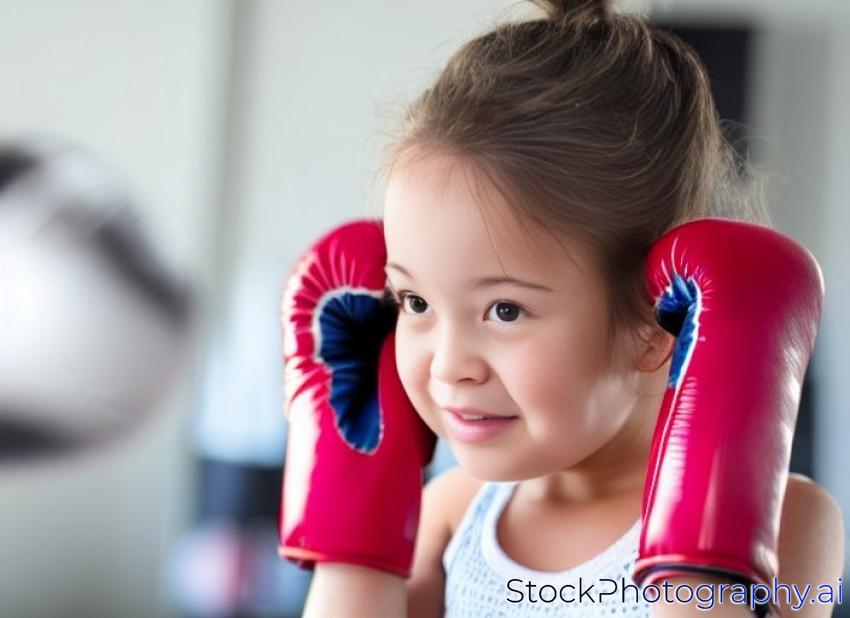 active background beautiful box boxer boxing caucasian child competitive concept cute daughter determined expression female feminism fight fighter fist fitness fun funny game girl glove hands head isolated kid little lovely person portrait power pugilist red serious sport strength tough training white woman young-