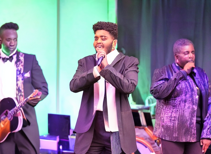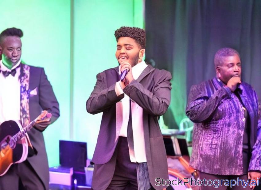 male singer on the stage of the evening show. photo with copy space