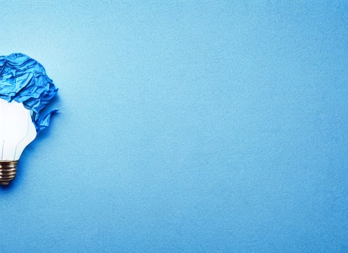 new idea concept with blue crumpled office paper and light bulb. top view of great business idea concept over blue background. creative solution during brainstorming session concept