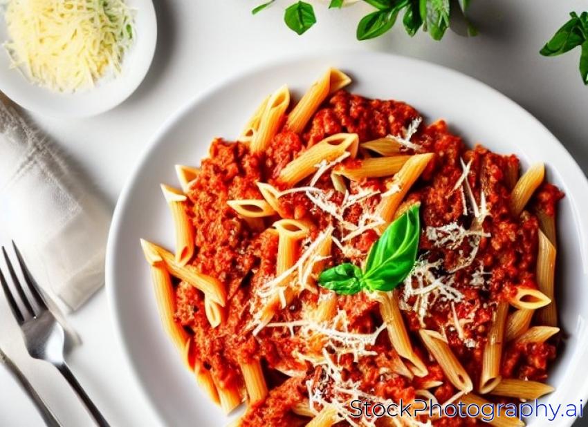 penne pasta with Bolognese sause and parmesan cheese in white plate, selective focus