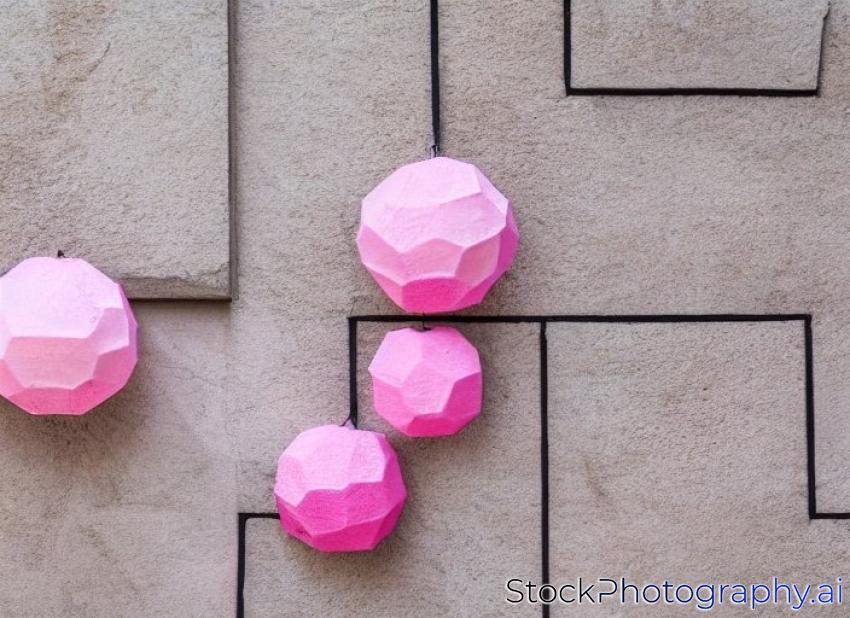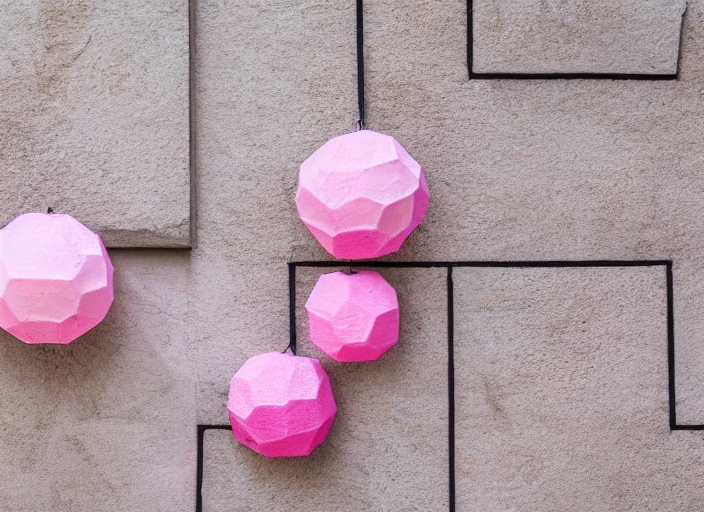 pink hanging decorative paper honeycomb ball in front of a stone pavement