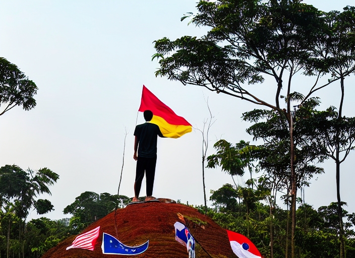 portrait of man on top of the hill in the morning rising malaysia flag celebrating independence day
