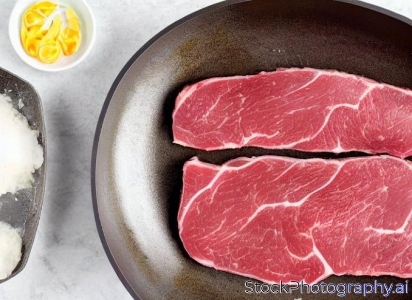 raw beef steaks in the teflon pan