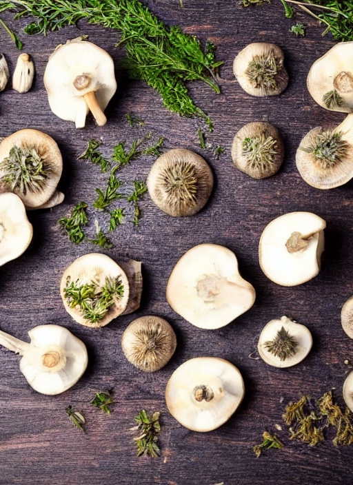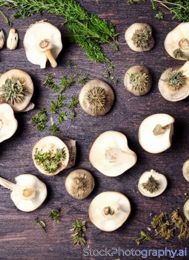 raw eryngii Mushrooms with herbs and spices on dark wooden table,preparation, top view