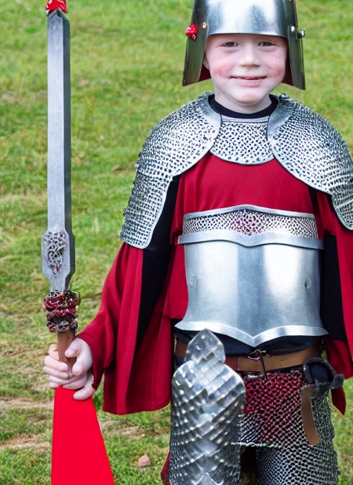 red-haired six years old boy on a neutral background, dressed as a knight in imitation chain mail and holding a long toy sword
