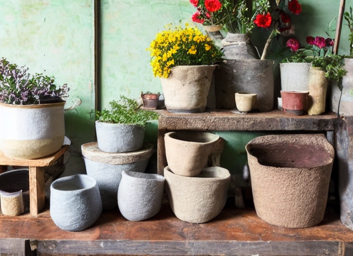 rustic display of pots,wool,and flowers
