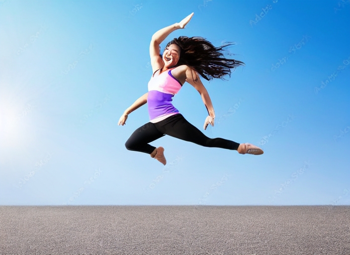 sport, fitness, motion and people concept - happy smiling young woman jumping in air or dancing over blue background