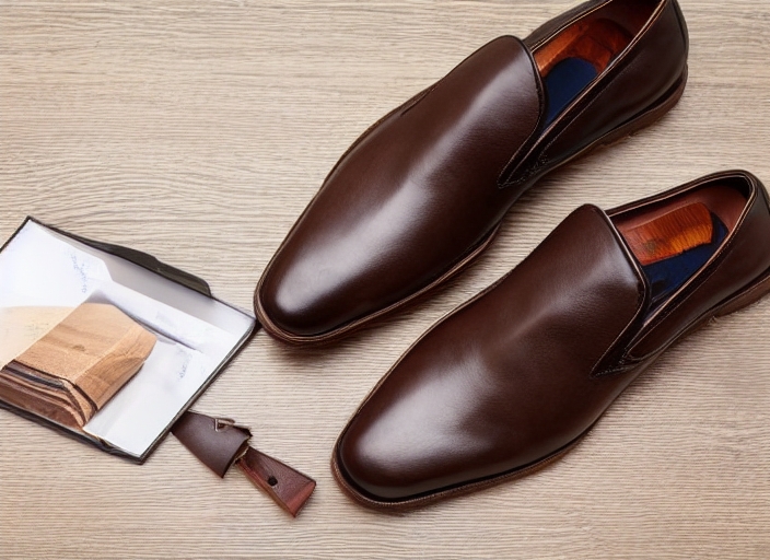 stylish brown leather slip on shoe with rubber sole on a box in a wooden shelf display with copy space.