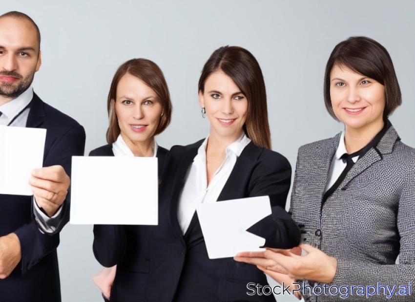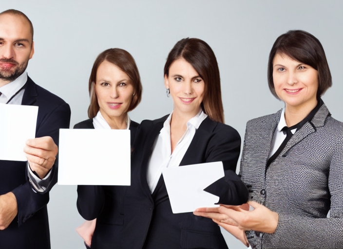 three person, a businessman and two woman holding a white card together