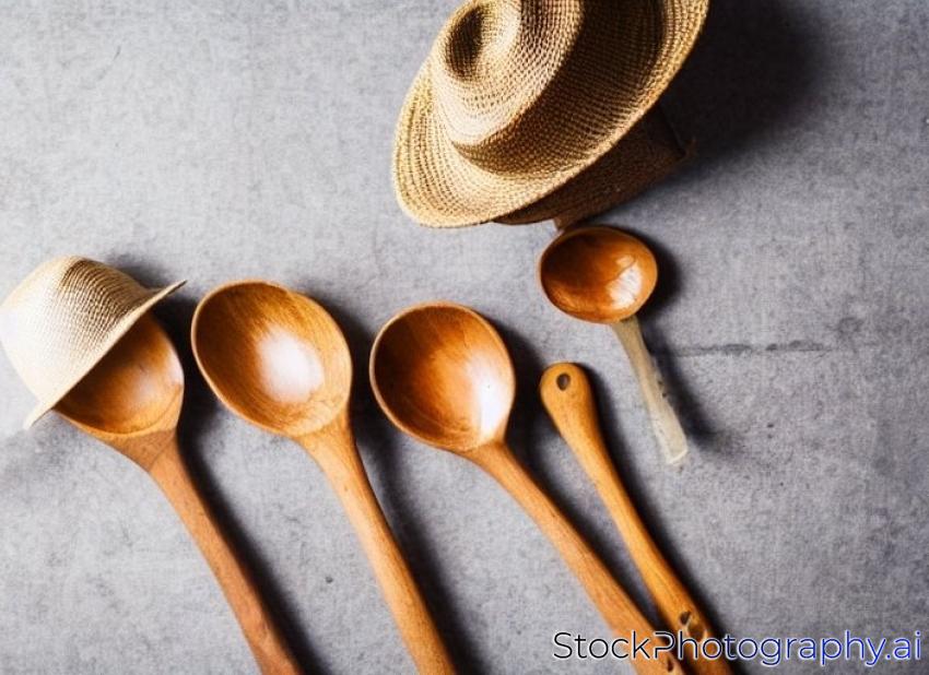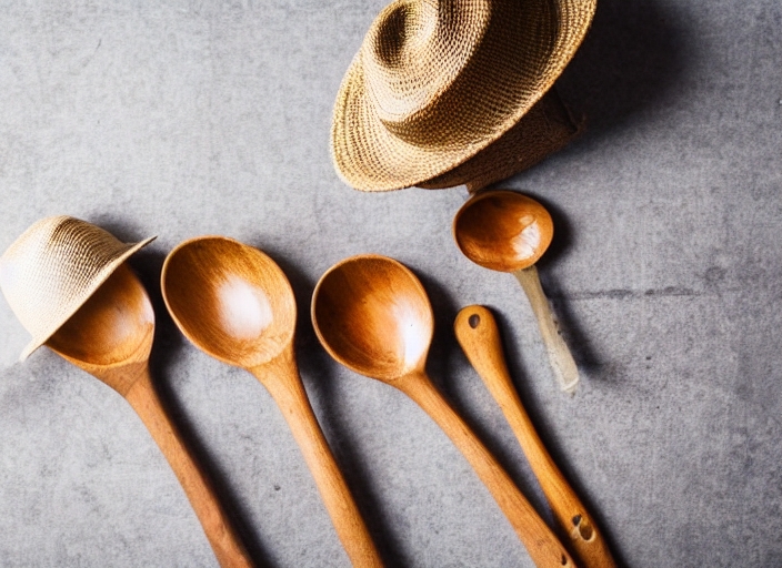 wooden spoons on vintage table in kitchen with hat