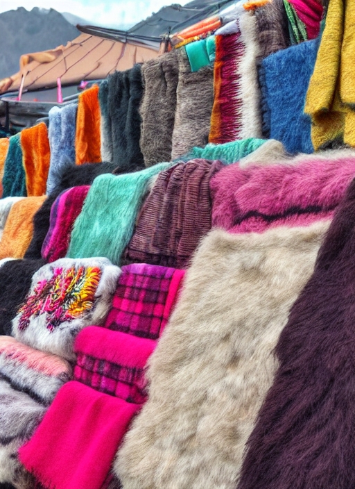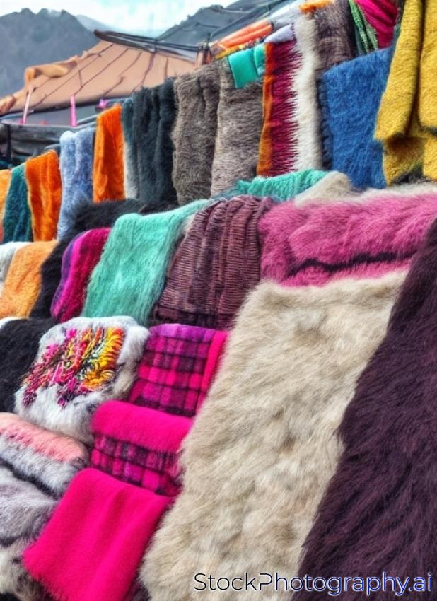 A set of alpaca designed scarves being sold on a cloudy day at the textiles market in Peru
