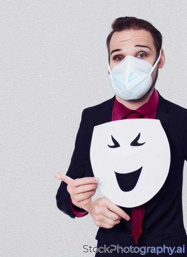Funny man wearing party mask, isolated on white background.