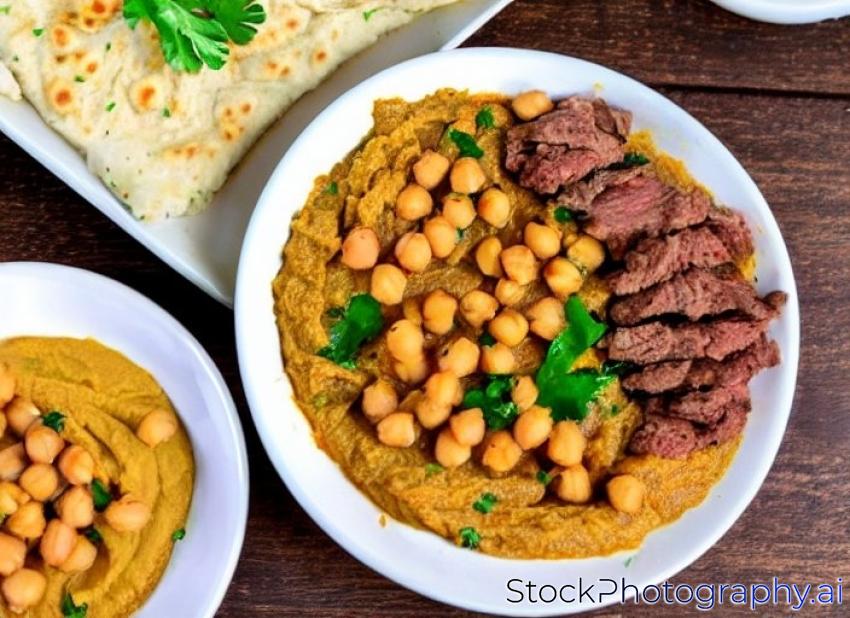 Hummus Mashawsha with meat and Chick peas. Traditional Middle Eastern cuisine