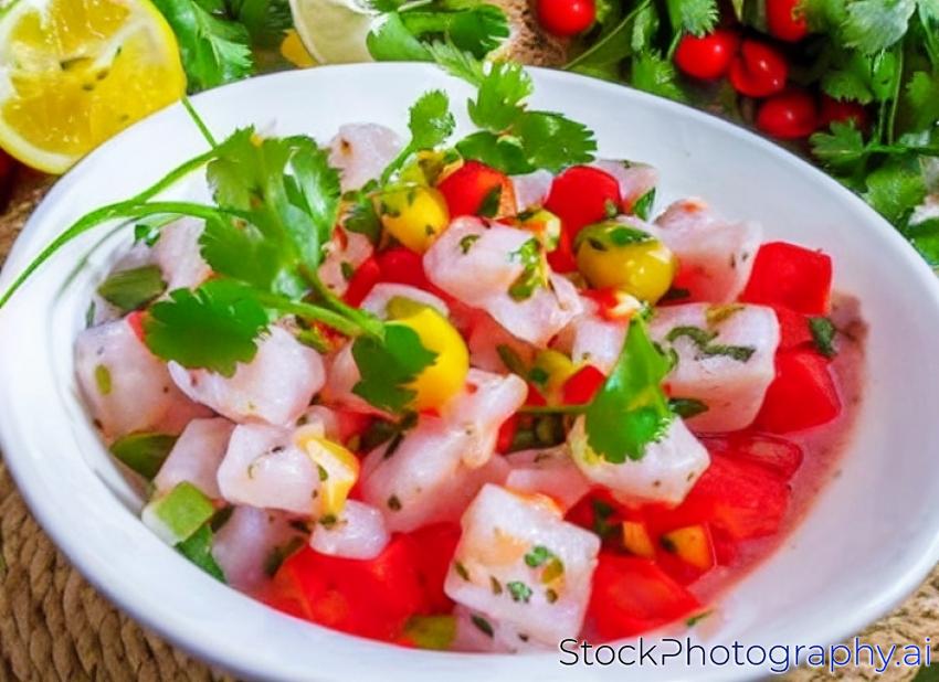 Peruvian food national dish ceviche made from fresh raw fish with pepper sauce chopped parsley lemon olives and tomatoes restaurant first course in a white bowl