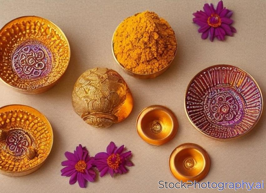 Terracotta diyas with glowing arranged in a brass plate with flowers, haldi and kumkum. Rava or semolina laddu kept aside. These are the elements offered to god while worship