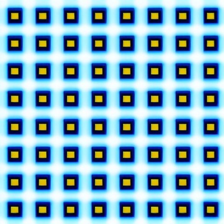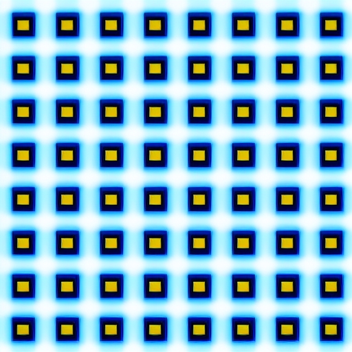 The optical illusion of movement executed in the form of rotating and pulsing blue squares. Seamless background.