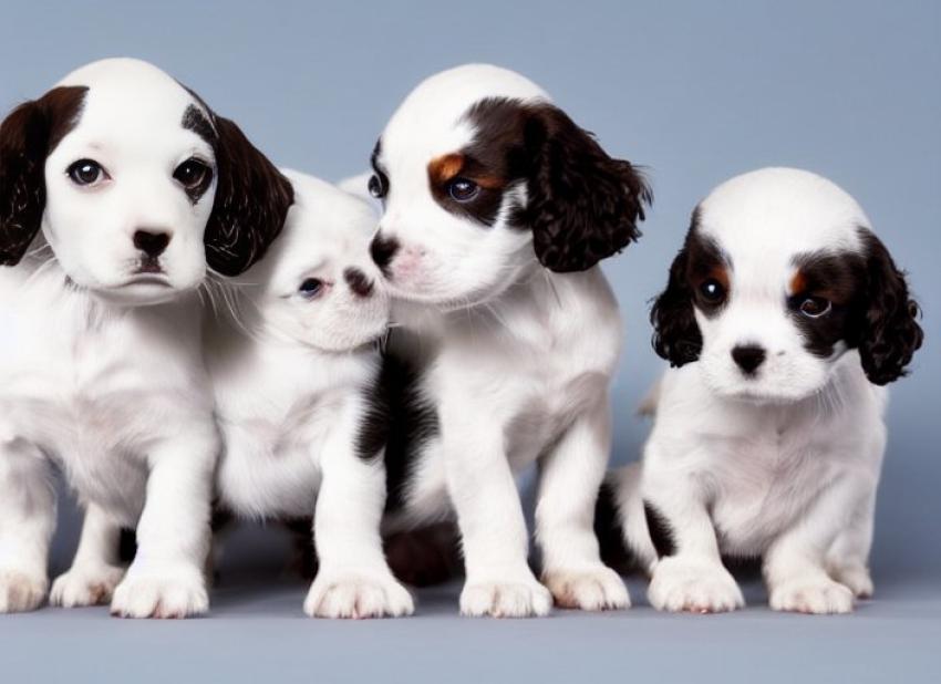 Three little spotted white-red puppy of breed Russian spaniel isolated on a white background. A dog is a friend of man.