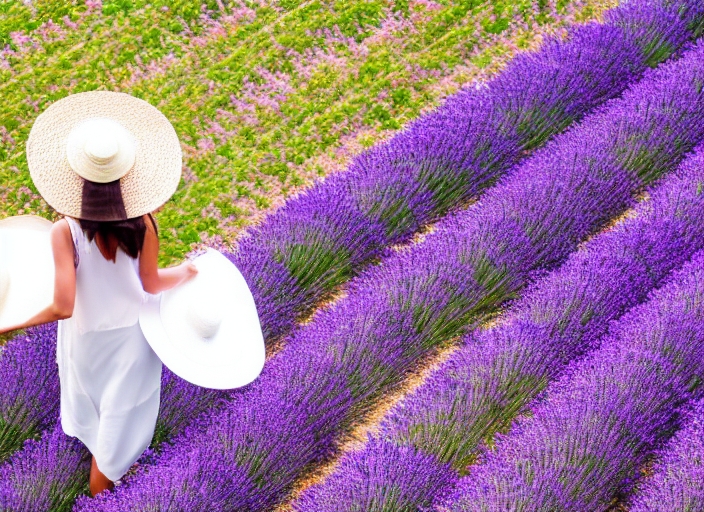 Top view of a woman in white dress holding a white hat and a basket with lavender flowers and walking through the lavender field.