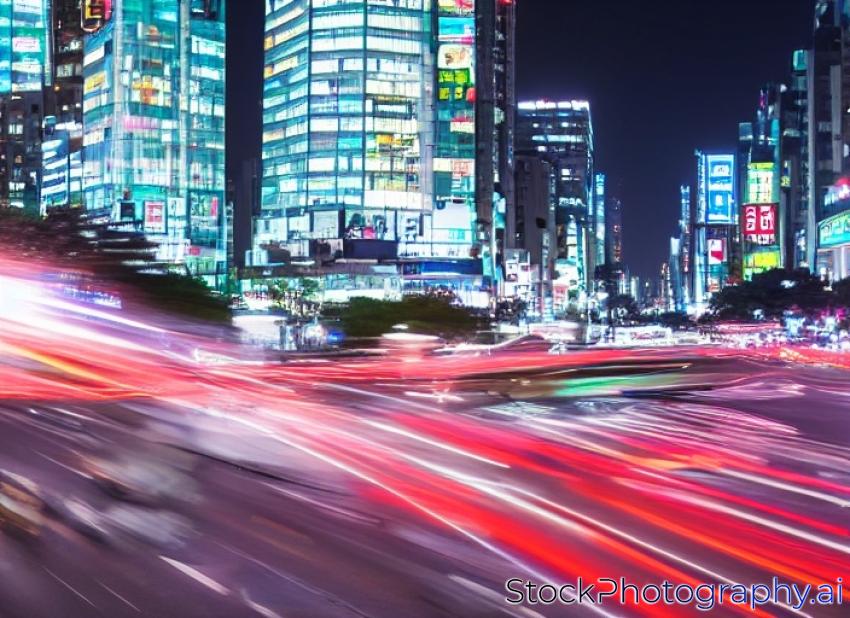 Traffic speeds through an intersection at night in Gangnam, Seoul in South Korea.