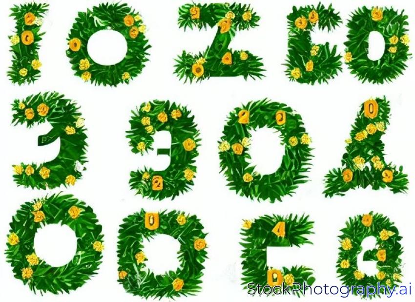 Tropical Green Gold Floral Numbers Set - digits 1, 2, 3, 4, 5, 6, 7, 8, 9, 0 with green gold leaves. Collection for wedding invites decoration, birthdays & other concept ideas.