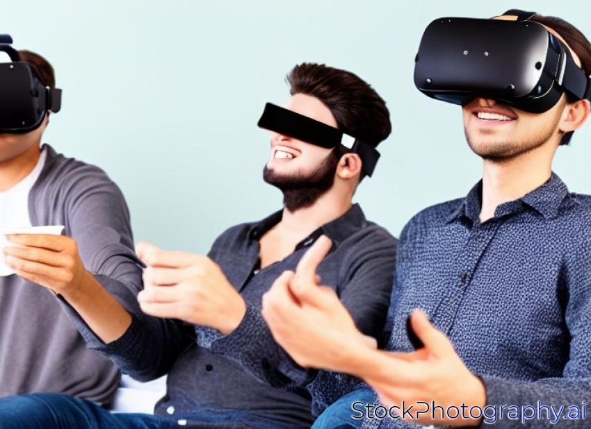 Two men in virtual reality glasses sitting on sofa and eating popcorn