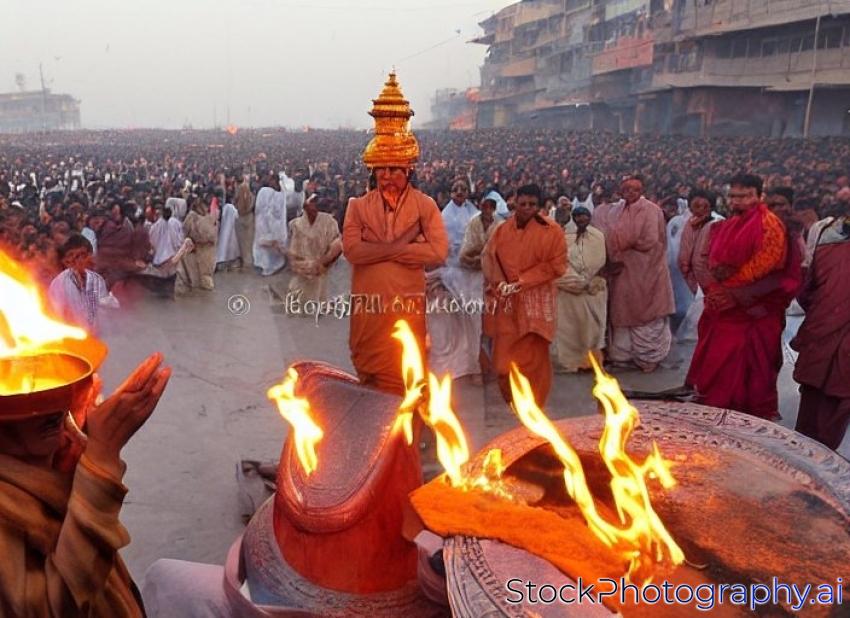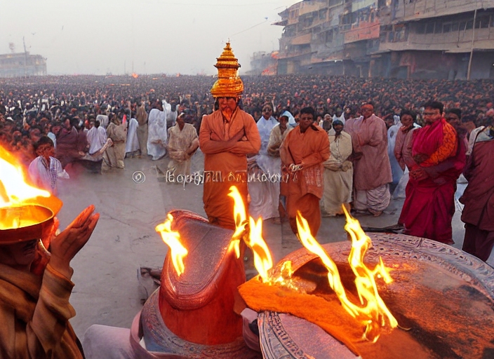 VARANASI, INDIA - JANUARY 14: Indian Brahmin conducts religious Ganga Maha Aarti ceremony (fire puja) at Dashashwamedh Ghat on January 14, 2010 in Varanasi, Uttar Pradesh, India.