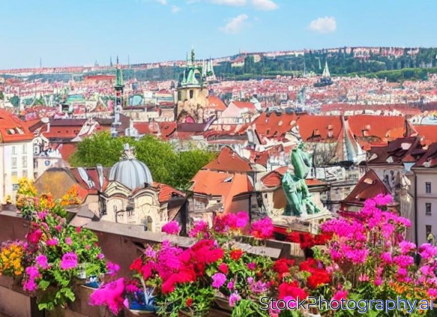 View from Rooftop Terrace Overlooking European City with Planted Flowers on a Beautiful Sunny Day with Blue Sky in Prague Czech Republic Capital
